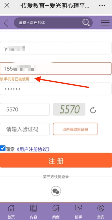 3、如果手机号已经被使用也无法注册,注意看下方红字提示